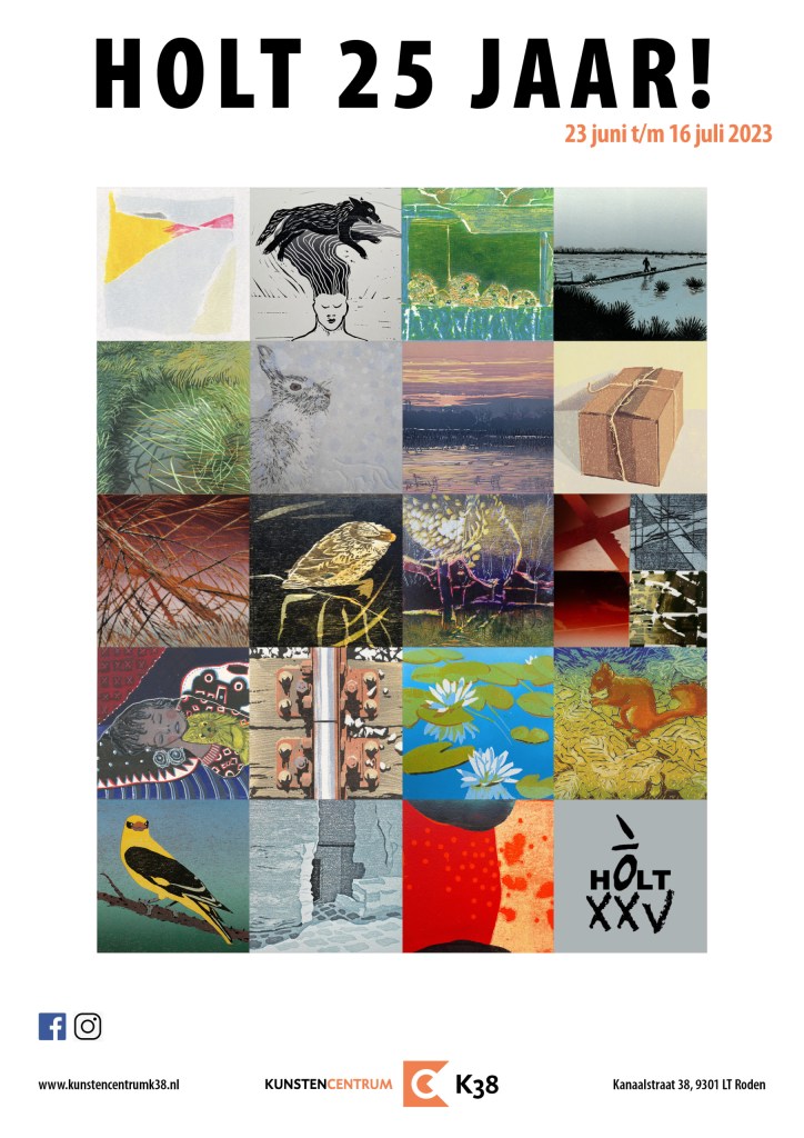 In K38 wordt vrijdag 23 juni om 17 uur de tentoonstelling ‘Hôlt 25 jaar’ geopend. Hôlt is een vereniging van 21, voornamelijk noordelijke, grafici en werd 25 jaar geleden werd opgericht op akademie Minerva in Groningen. Doel van de vereniging is het ontwikkelen en promoten van de hoogdruk zoals de hout- en linoleumsnede.