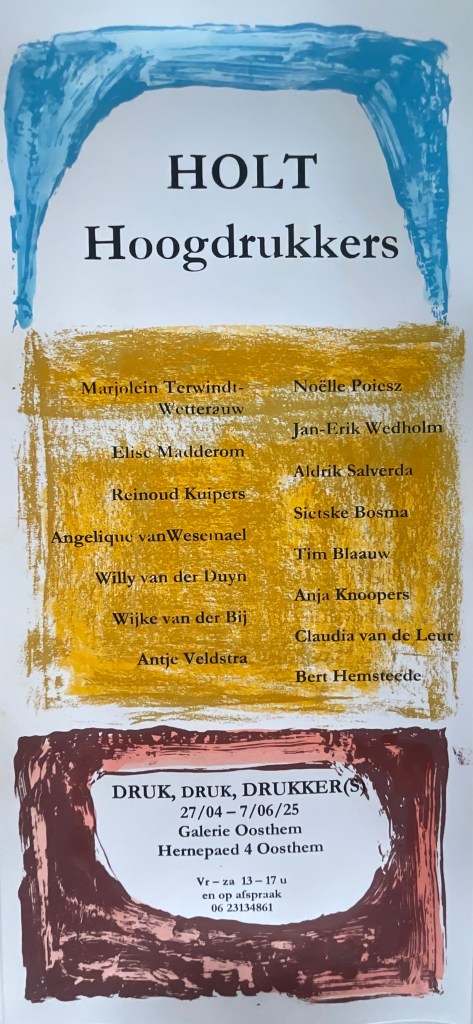 | Galerie Oosthem Hernepaed 4 – 8618 NN Oosthem 06 23134861 Openingstijden: vrijdag en zaterdag van 13.00 – 17.00 uur én op afspraak Op onze website vindt u veel informatie over HOLT, de exposanten en de activiteiten rondom DRUK, DRUK, DRUKKER(S). |